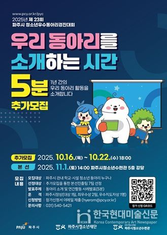 한국현대미술신문 배윤섭 기자 | (재)파주시청소년재단 파주시청소년수련관은 오는 10월 16일부터 10월 22일까지 “제23회 파주시 청소년우수동아리경진대회”의 참가 동아리를 모집한다.