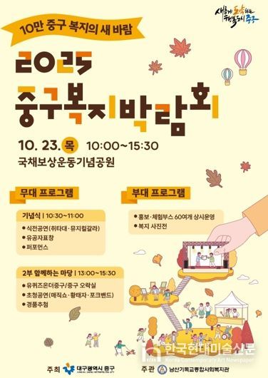 한국현대미술신문 정소영 기자 | 대구 중구는 오는 10월 23일 중구 국채보상운동기념공원에서 2025 중구 복지박람회를 개최한다고 밝혔다.