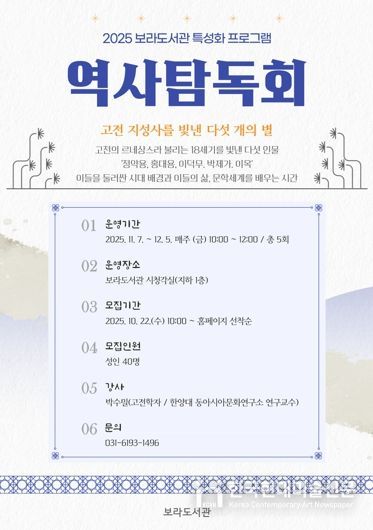 한국현대미술신문 배윤섭 기자 | 용인특례시 보라도서관은 오는 11월 7일부터 12월 5일까지 고전 인문학 프로그램으로 ‘2025 역사 탐독회’를 운영한다고 21일 밝혔다.