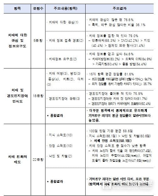 이번 조사는 ▴치매에 대한 관심 및 정보요구도(3개 항목-5문항) ▴치매 및 경도인식장애 인식도(6개 항목-18문항) ▴치매 친화적 태도(3개 항목-22문항) 등 총 45개 문항으로 진행됐다. 특히 올해부터는 더욱 정밀한 분석을 위해 경도인지장애 인식도(3문항)를 추가하고 별도로 수행했던 치매 친화적 태도(22문항)를 함께 진행했다.