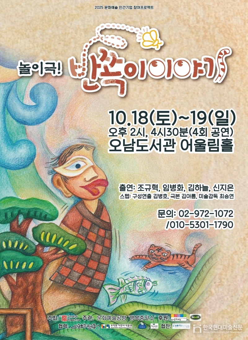 한국현대미술신문 김미정 기자 | 남양주시 오남도서관 어울림홀에서 10월 18일부터 19일까지 공연된 놀이극 ‘반쪽이 이야기’(연출 김병호)가 가족 관람객들의 뜨거운 호응 속에 막을 내렸다.