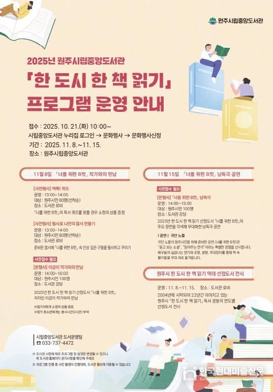 한국현대미술신문 원진 기자 | 원주시립중앙도서관은 11월 8일부터 15일까지 ‘한 도시 한 책 읽기’와 연계한 다양한 독서문화 행사를 운영한다.