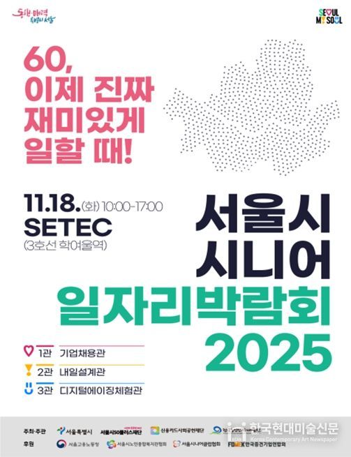 한국현대미술신문 배건 기자 | 서울시는 오는 11월 18일 SETEC(강남구)에서 '서울시 시니어 일자리박람회 2025'를 개최한다. 초고령사회 대응 종합대책 ‘9988 서울 프로젝트’의 하나로 마련된 이번 박람회에서는 시니어들이 쌓아온 경력과 전문성을 살려 경제적 자립을 이루고 사회참여를 확대할 수 있도록 다양한 프로그램이 진행된다.