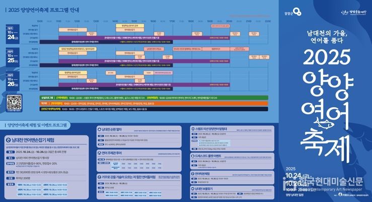 한국현대미술신문 원진 기자 | 가을의 생명력과 생태의 순환을 주제로 한 ‘2025 양양연어축제’가 오는 10월 24일부터 26일까지 3일간 양양읍 남대천 둔치 일원에서 개최된다.