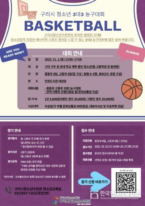 한국현대미술신문 배윤섭 기자 | 구리시청소년재단 청소년수련관은 '2025 구리시 청소년 3대3 농구대회' 참가 신청을 10월 22일부터 10월 27일까지 온라인으로 신청받는다고 밝혔다.