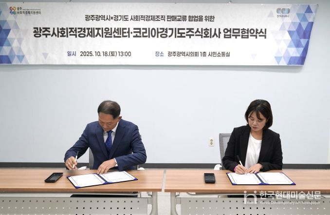 한국현대미술신문 배윤섭 기자 | 경기도주식회사와 광주광역시 사회적경제지원센터가 지난 18일 광주광역시 시의회에서 ‘경기도-광주광역시 사회적경제조직 판매교류 협업을 위한 업무협약’을 체결하고 사회적경제조직 활성화를 위해 공동 노력하기로 했다.