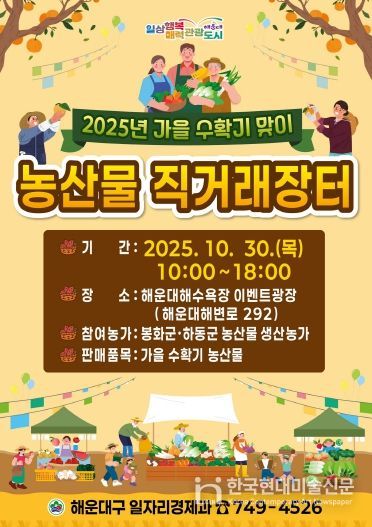 한국현대미술신문 정소영 기자 | 해운대구는 30일 오전 10시~오후 6시 해운대해수욕장 이벤트광장에서 ‘가을 수확기 맞이 농산물 직거래장터’를 연다.
