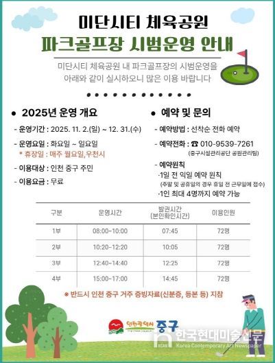 한국현대미술신문 박재남 기자 | 인천시 중구는 미단시티 체육공원 내에 ‘파크골프장’을 새로 조성하고, 오는 11월 2일부터 시범운영에 들어간다고 밝혔다.