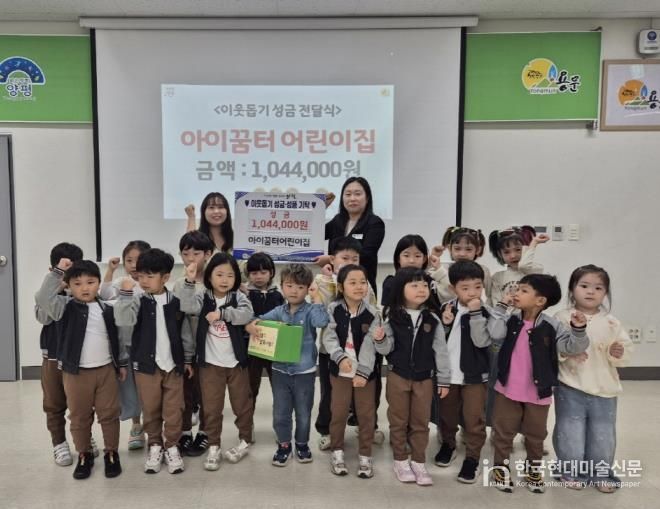 한국현대미술신문 배윤섭 기자 | 양평군 용문면은 지난 20일 용문면 소재 아이꿈터 어린이집이 주최한 ‘소소한 기쁨, 특별한 만남, 행복 나눔 작은 장터’ 바자회를 통해 마련된 수익금 1,044,000원을 용문면에 기탁했다고 밝혔다.