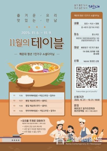 한국현대미술신문 정소영 기자 | 해운대구는 11월 6~9일 청년 1인 가구를 위한 소셜다이닝 ‘11월의 테이블’을 연다.