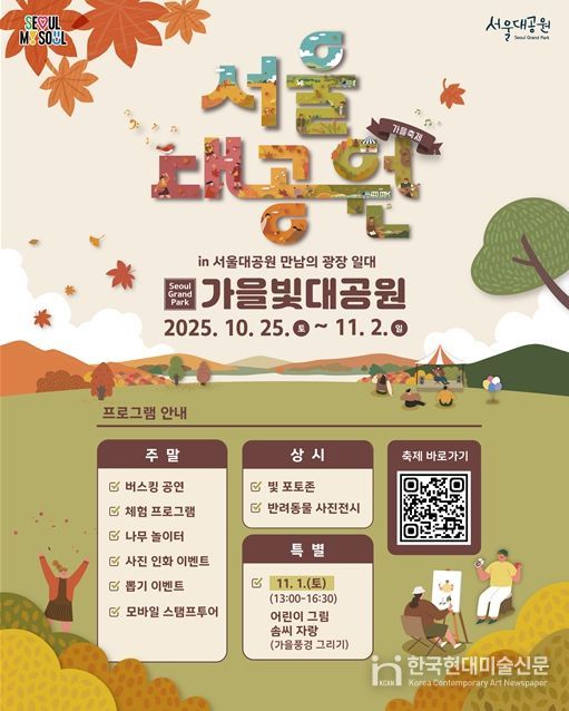 한국현대미술신문 배건 기자 | 서울대공원 2025년 가을단풍축제 ‘가을빛대공원’이 10월 25일부터 11월 2일까지 서울대공원 일대에서 개최된다. 공원 전체를 가을빛으로 물들인 형형색색의 단풍을 즐길 수 있는 절호의 기회이다.
