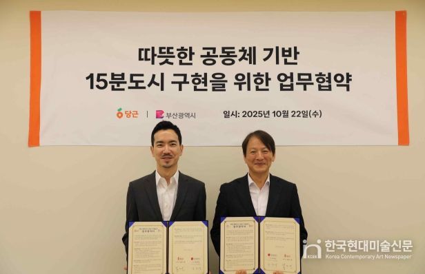 한국현대미술신문 정소영 기자 | 부산시는 22일 오후 2시 10분 서울 ㈜당근마켓 본사에서 ㈜당근마켓(대표이사 황도연)과 '따뜻한 공동체 기반 15분도시 구현을 위한 업무협약'을 체결했다고 밝혔다.