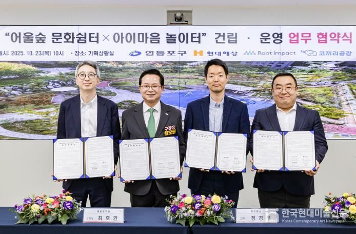 한국현대미술신문 배건 기자 | 영등포구가 10월 23일 현대해상, 루트임팩트, 코끼리공장과 함께 ‘어울숲 문화쉼터×아이마음 놀이터’ 건립과 운영을 위한 다자간 업무협약을 체결했다고 밝혔다.
