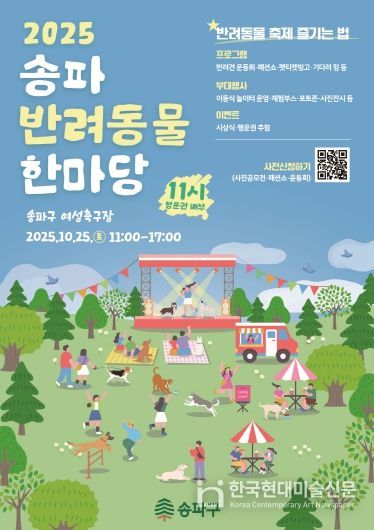 한국현대미술신문 배건 기자 | 서울 동물보호의 날(10월 4일)을 맞아 서울 송파구가 오는 25일 토요일 11시부터 17시까지 송파구여성축구장에서 ‘2025 송파 반려동물 한마당’을 개최한다고 알렸다.