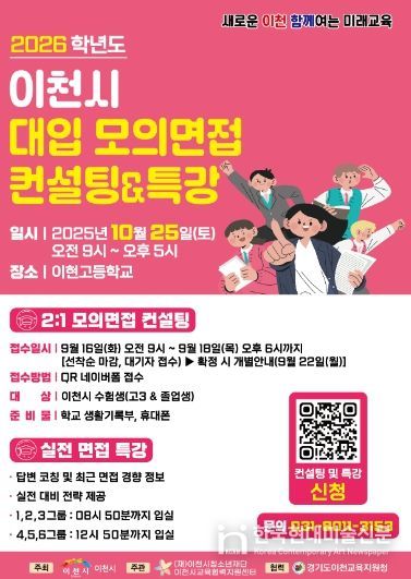 한국현대미술신문 배윤섭 기자 | 이천교육지원청은 10월 25일 이현고등학교에서 ‘2026학년도 이천시 대입 모의면접 컨설팅 및 특강’을 운영한다.