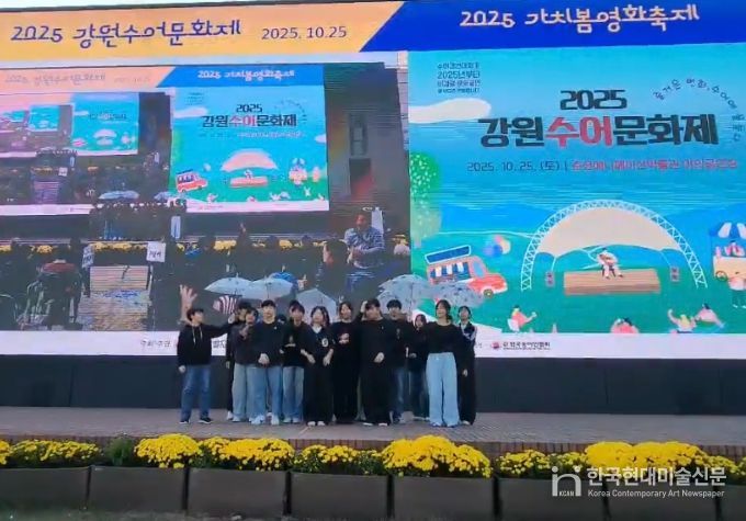 한국현대미술신문 원진 기자 | 속초시시설관리공단 청소년방과후아카데미 청소년들이 10월 25일 춘천 애니메이션박물관 야외무대에서 열린 2025 강원수어문화제 수어경연대회에 참가해 수어 노래극 ‘초록비’를 선보였다. 이번 공연을 통해 청소년들은 수어로 모두 하나되는 화합의 메시지를 전달하며, 그 의미를 인정받아 ‘손길하모니상’을 수상하는 영예를 안았다.