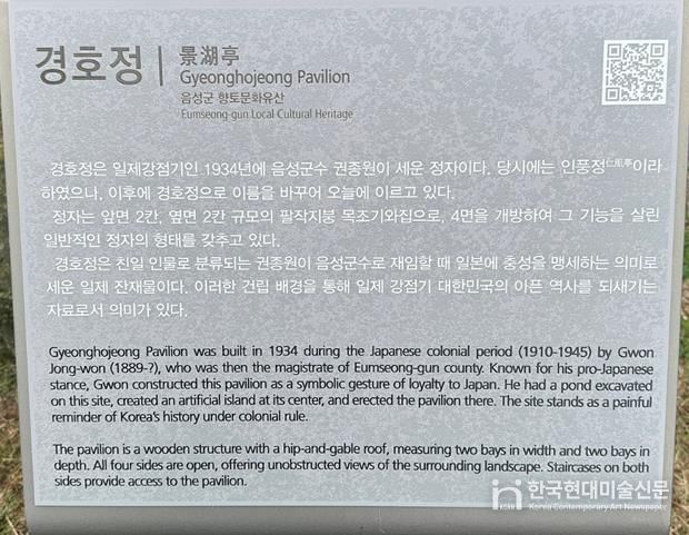 한국현대미술신문 신정은 기자 | 음성군은 일제 잔재물로 알려진 향토문화유산 ‘경호정’의 안내판의 문구를 수정해 재설치했다고 31일 밝혔다.