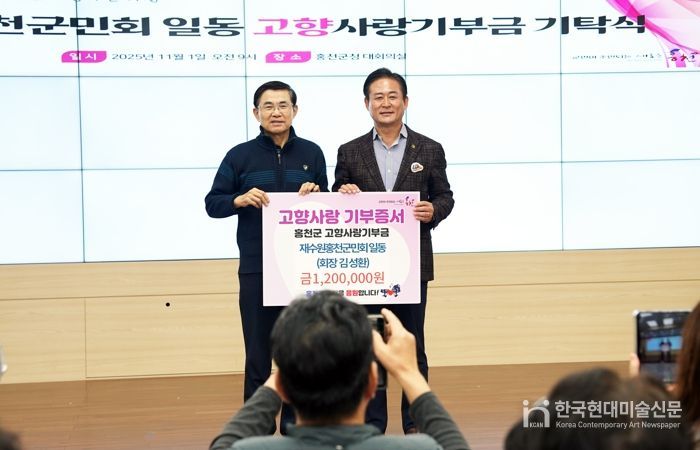 한국현대미술신문 원진 기자 | 재수원홍천군민회 회원들과 이호용 재수원강원특별자치도민회장은 11월 1일 홍천군청을 방문하여 고향사랑기부금 각각 1백2십만원, 1백만원을 전달했다.