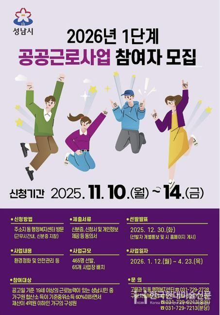 한국현대미술신문 배윤섭 기자 | 성남시는 오는 11월 10일부터 14일까지 ‘2026년도 1단계 공공근로사업’ 참여 희망자 465명을 모집한다.
