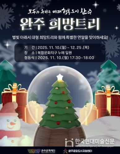 완주문화도시지원센터 조준모 센터장은 “희망 트리를 통해 군민 모두가 따뜻한 연말을 보내고, 새해에도 서로에게 힘이 되는 공동체의 빛을 이어가길 바란다”며 “완주 곳곳에 문화의 온기가 퍼질 수 있도록 다양한 프로그램을 이어가겠다”고 말했다.