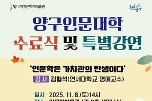 한국현대미술신문 원진 기자 | 양구군은 8일 양구인문학박물관 세미나실에서 인문대학 수료식 및 특별강연을 진행한다.