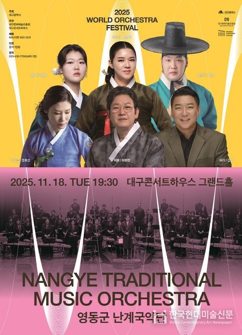 한국현대미술신문 정소영 기자 | (재)대구문화예술진흥원 대구콘서트하우스는 오는 11월 18일 저녁 7시 30분, 그랜드홀에서 ‘2025 월드오케스트라페스티벌’의 특별한 무대로 ‘영동군 난계국악단’의 공연을 개최한다.