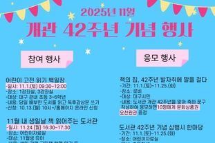주요 행사로는 ▲42주년을 축하하는 문구를 작성하는 ‘책의 집, 42주년 발자취에 말을 걸다’, ▲도서관과 관련된 삼행시를 공모하는 ‘도서관 42주년 기념 삼행시 한마당’ 등을 11월 25일까지 실시한다.