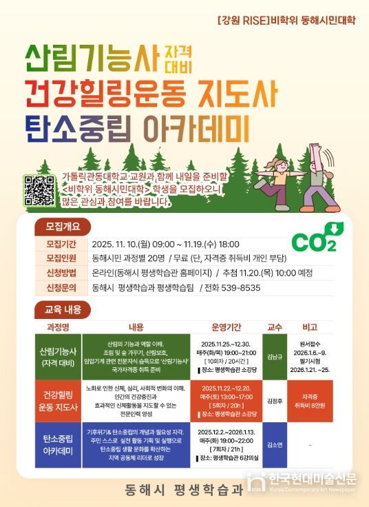 한국현대미술신문 원진 기자 | 동해시는 시민의 평생학습 역량 강화를 위해 '비학위 동해시민대학' 전문과정으로 ▲산림기능사(자격대비) ▲건강힐링운동 지도사 ▲탄소중립 아카데미 3개 과정을 개설하고, 오는 11월 19일까지 동해시 평생학습관 홈페이지를 통해 수강생을 모집한다.