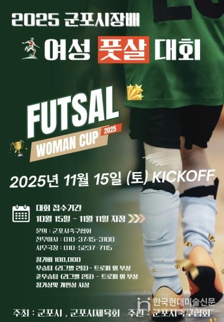 한국현대미술신문 배윤섭 기자 | 군포시는 여성 생활체육 참여 확대와 건전한 스포츠 문화 확산을 위해 ‘2025 군포시장배 여성 풋살대회’를 오는 11월 15일(토) 군포시 국민체육센터 축구장에서 개최한다.