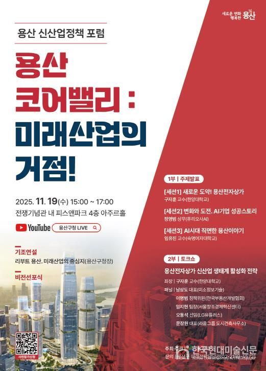 한국현대미술신문 배건 기자 | 서울 용산구가 AI(인공지능)·ICT(정보통신기술) 산업 중심지로의 도약을 선언했다. 구는 오는 11월 19일 전쟁기념관 피스앤파크 아주르홀에서 ‘용산 코어밸리, 미래산업의 거점’을 주제로 ‘용산 신산업정책 포럼’을 연다고 11일 밝혔다.