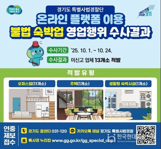 한국현대미술신문 배윤섭 기자 | 숙박업 신고 없이 오피스텔, 주택 등에서 영업을 한 불법 숙박업체 13곳이 경기도 특별사법경찰단 수사에 적발됐다.