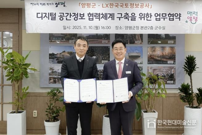 한국현대미술신문 배윤섭 기자 | 양평군은 지난 10일 LX한국국토정보공사와 ‘디지털 공간 정보 협력체계 구축을 위한 업무협약(MOU)’을 체결하고, 군민이 체감할 수 있는 스마트 행정 서비스 확대에 나섰다.