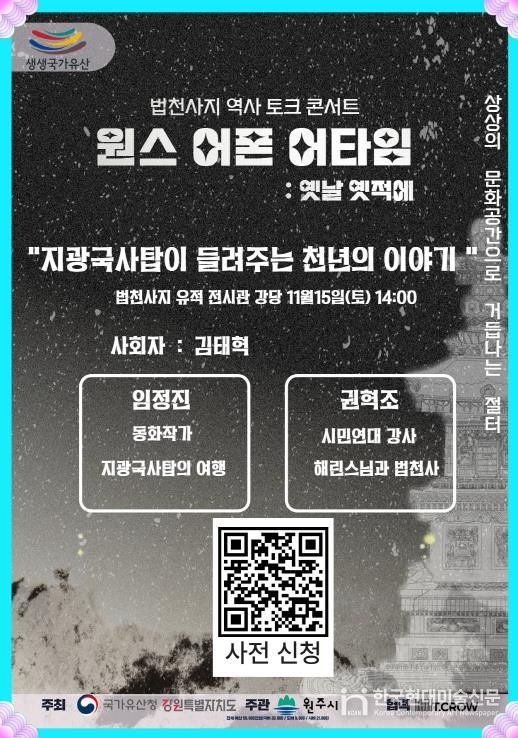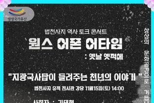 이 사업의 일환으로 11월 15일 열리는 이번 토크 콘서트에서는 시민연대 강사, 동화 작가, 지역 주민, 참여자들이 모여 법천사지의 역사·문화에 대해 알아보고 토의하는 시간을 가질 예정이다.
