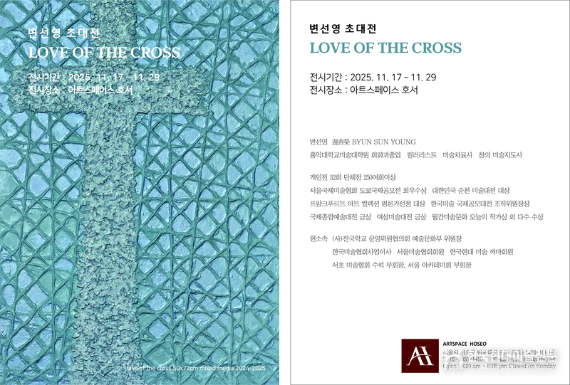 서울 금천구 아트스페이스 호서에서 변선영 작가의 초대전 ‘LOVE OF THE CROSS’가 2025년 11월 17일부터 29일까지 열린다. 이번 전시는 작가가 지난 몇 년간 집중적으로 탐구해 온 ‘십자가(Cross)의 조형적 변용과 상징성’을 주제로, 종교적 모티프를 현대 회화의 구조·질감·색채 실험을 통해 재해석한 작품들을 선보인다.