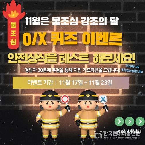 한국현대미술신문 기자 | 전북특별자치도소방본부는 11월 ‘불조심 강조의 달’을 맞아 도민의 생활 속 화재예방 인식을 높이기 위한 SNS O/X 퀴즈 이벤트를 진행한다.