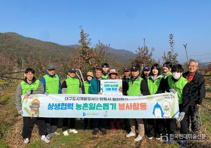 한국현대미술신문 정소영 기자 | 대구도시개발공사는 지난 11월 14일 안동시 길안면에서 수확철 농가의 인력 부족 해소와 지역 상생을 위해 사과 농가 일손돕기 봉사활동을 진행했다.