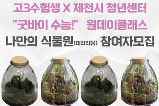 굿바이 수능은 고3 수능 수험생들을 대상으로 하는 원데이클래스 프로그램으로 △퍼스널컬러진단 △나만의 식물정원 테라리움 만들기 등 두 개의 주제로 오는 11월 25일(화) 오후 14시부터 16시까지 운영될 예정이다. 또한 예비 청년으로서 알아두면 유익할 제천시 청년정책 및 지원 제도 소개도 함께 진행될 예정이다.