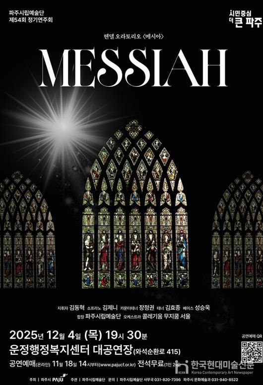 한국현대미술신문 배윤섭 기자 | 파주시는 오는 12월 4일 19시 30분, 운정행복센터 대공연장에서 시립예술단 제54회 정기연주회 ‘헨델 오라토리오 '메시아'’를 선보인다고 밝혔다.