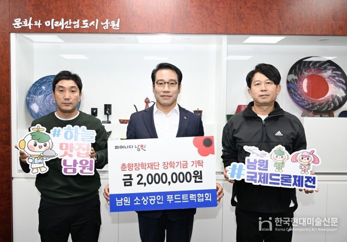 한국현대미술신문 기자 | 남원시는 지난 10월 16일부터 19일까지 나흘간 남원종합스포츠타운 일원에서 열린 '2025 남원국제드론제전 with 로봇'이 성황리에 막을 내린 가운데, 행사에 참여한 전국푸드트럭소상공인협회 소속 15개 업체가 드론제전에서 얻은 수익금의 일부인 총 200만원을 춘향장학재단에 기탁했다.
