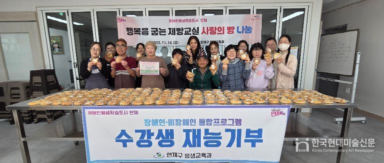 한국현대미술신문 정소영 기자 | 연제구는 11월 14일 아델라디저트아카데미학원에서 장애인과 장애인 가족들로 구성된 수강생들이 2달여 간 배운 제빵 기술로 앙금 소보루빵 100개를 만들어 장애인직업재활시설부산직업재활원 장애인 근로자에게 전달하는 행복을 굽는 제빵교실 ‘사랑의 빵’ 나눔을 진행했다고 밝혔다.
