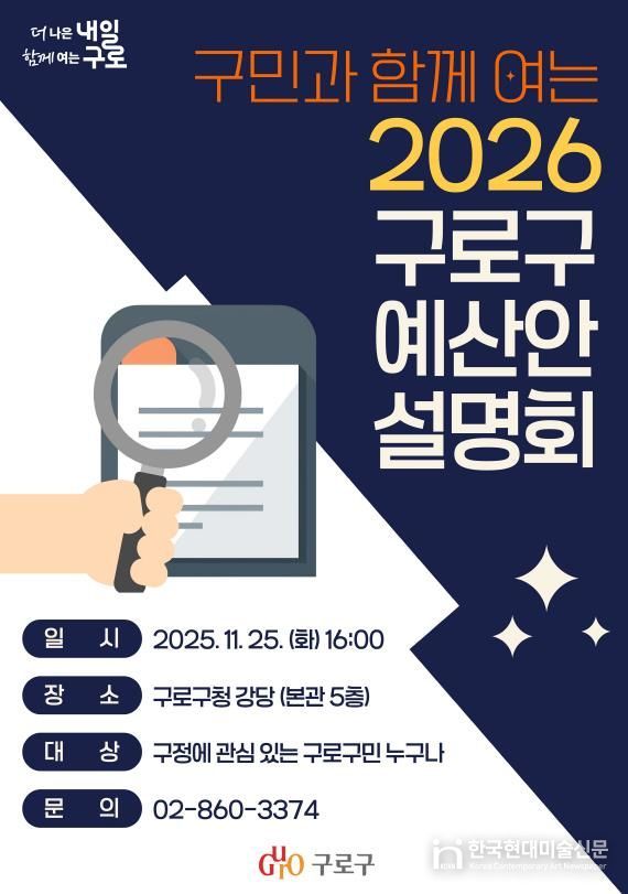 한국현대미술신문 배건 기자 | 구로구가 11월 25일 오후 4시 구로구청 5층 강당에서 ‘구민과 함께 여는 2026년 구로구 예산안 설명회’를 연다.