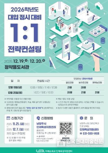 한국현대미술신문 배윤섭 기자 | 남양주시는 11월 21일부터 12월 7일까지 ‘2026학년도 대입 정시 대비 1:1 전략컨설팅’에 참여할 관내 수험생을 모집한다.