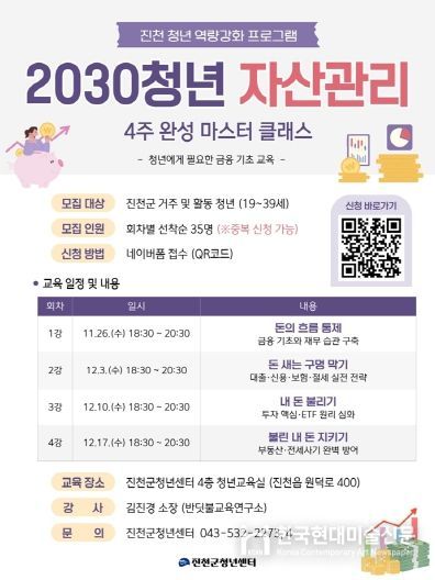 한국현대미술신문 신정은 기자 | 충북 진천군 청년센터는 지역 청년들의 안정적인 자산 형성과 금융 역량 강화를 위해 ‘청년 자산관리 4주 완성 마스터 클래스’를 운영한다고 20일 밝혔다.