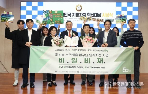 한국현대미술신문 배건 기자 | 꿈이 모이는 도시, 미래를 그리는 강남구가 ‘2025 대한민국 지방자치 혁신대상’에서 환경혁신 부문 대상을 수상했다. 폐비닐 분리배출 촉진을 위해 전국 최대 규모의 전용봉투를 보급하고, 민관 협력을 통해 자원순환 시스템을 구축한 점이 높은 평가를 받았다.