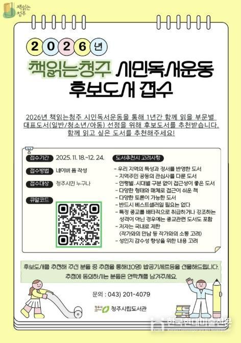 한국현대미술신문 신정은 기자 | 청주시립도서관은 시민 독서운동 ‘책읽는청주’의 2026년도 대표도서 선정을 위해 오는 12월 24일까지 시민 추천을 접수한다고 21일 밝혔다.