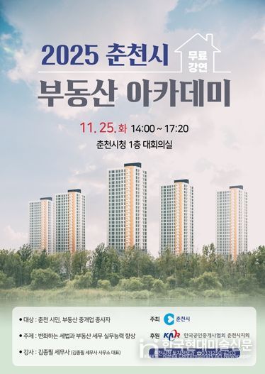 한국현대미술신문 원진 기자 | 춘천시가 초고령화 시대에 접어들며 이슈가 되고 있는 부동산 세무의 핵심을 짚어보는 ‘2025 춘천시 부동산 아카데미’를 연다.