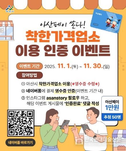 한국현대미술신문 신정은 기자 | 아산시는 지역 물가안정과 서민경제 지원을 위해 ‘착한가격업소’ 신규 신청 접수와 함께 시민 참여형 이용 인증 이벤트를 추진한다고 밝혔다.