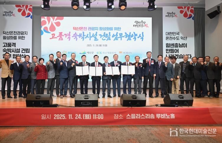한국현대미술신문 신정은 기자 | 예산군은 24일 충청남도, 충남개발공사, ㈜호반호텔앤리조트와 함께 덕산온천관광지에 고품격 숙박시설 및 컨벤션 기능을 갖춘 복합 휴양시설 건립을 위한 업무협약(MOU)을 체결했다.