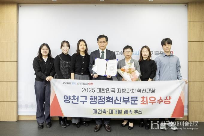한국현대미술신문 배건 기자 | 양천구는 장기간 답보 상태였던 도시정비사업을 전문성과 추진력으로 속도감 있게 이끈 성과를 인정받아 ‘2025 대한민국 지방자치 혁신대상’에서 행정혁신 부문 최우수상을 받았다고 25일 밝혔다. 지난해 도시혁신 부문 최우수상에 이어 2년 연속 우수기관으로 선정되는 성과다.