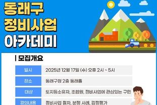 한국현대미술신문 정소영 기자 | 부산 동래구는 오는 12월 17일 오후 2시, 동래구청 2층 동래홀에서 재개발 및 재건축 정비사업에 대한 주민들의 이해를 높이고 추진 과정에서 발생할 수 있는 분쟁을 예방하기 위해 ‘2025년 동래구 정비사업 아카데미’를 실시한다고 밝혔다.